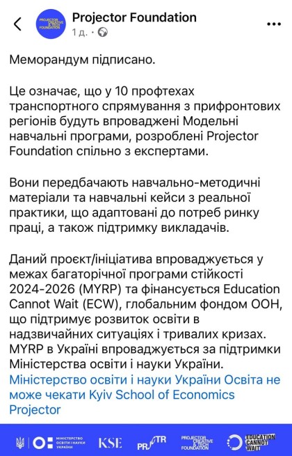 Директор нашого закладу Юрій ХРИСТІЙ взяв участь у підписанні важливого Меморандуму про співпрацю між ДНЗ « Білопільське ВПУ» та Громадською організацією « ФУНДАЦІЯ ПРОДЖЕКТОР», який відкриває нові можливості для розвитку та партнерства. https://www.instagram.com/prjctr_foundation?igsh=MXQ5emt1c21kcGp5NA==